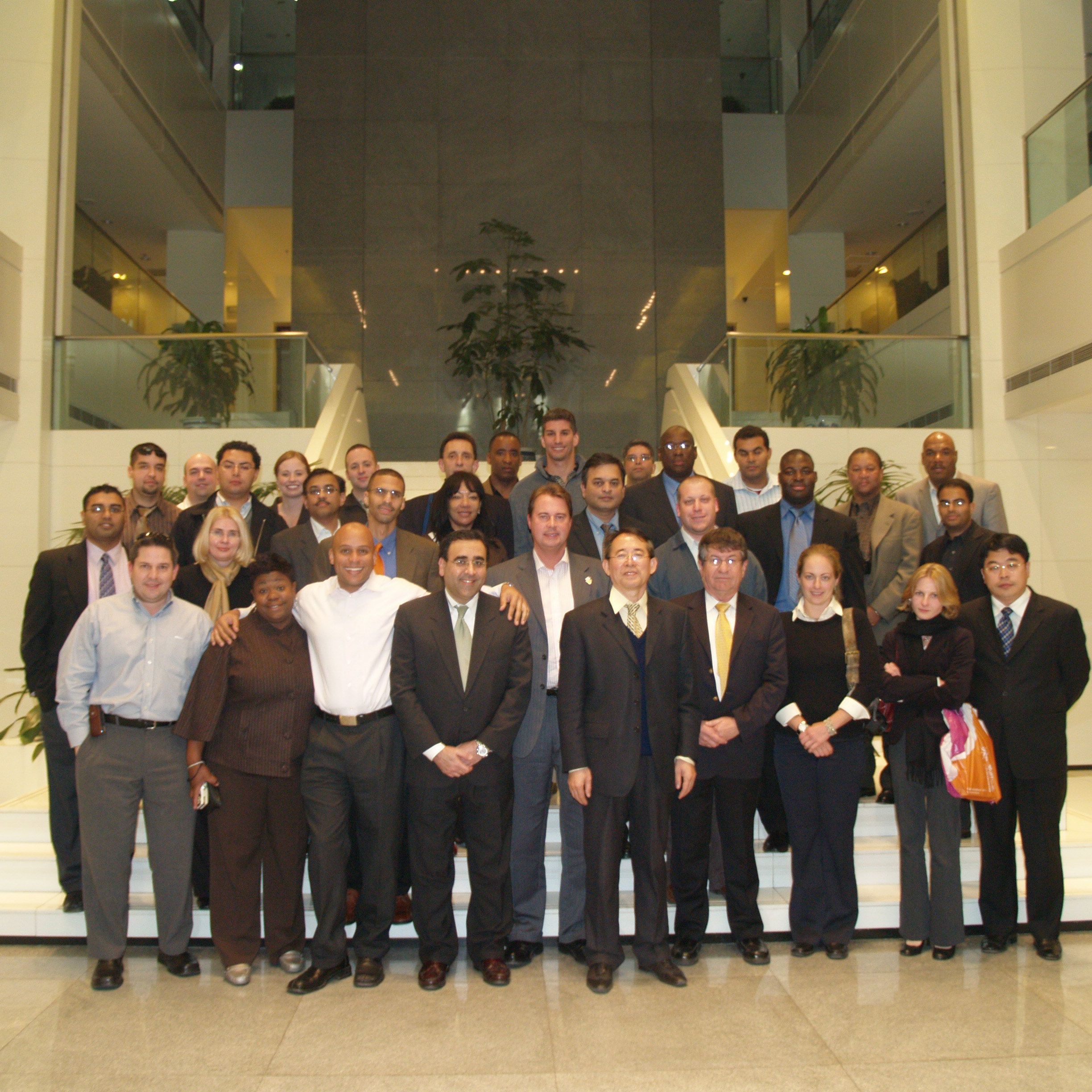 Upper Right Photo: EMBA students leaving a corporate visit with the President and Board of one of Europe’s most successful bio-tech companies, that was then seeking a location to expand into New Jersey. They later decided on New York and California due to the university research in those states.